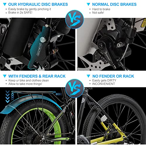 【Neues H7 Ebike Mountainbike】 Hydraulische Abbremsen mit USB-Telefonhalter, 4,0-Abgabe-Fettreifen, ausgestattet mit Fahrradrücksitz und LED-Scheinwerfer und Hupe, geeignet für Nachtfahrten. IP54 wasserdichtes Design, Sie müssen sich keine Sorgen über die Auswirkungen plötzlichen Regens auf das Fahrrad machen. E-MTB ist für alle Arten von Straßenoberflächen geeignet, geeignet für junge Männer und Frauen und auch als Geschenk für Erwachsene geeignet.