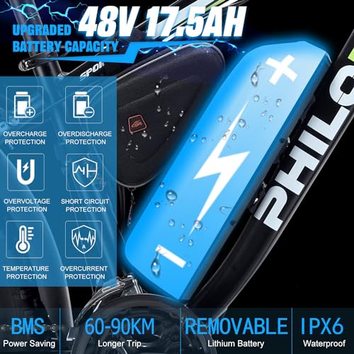 【Aktualisierung 840Wh Lithium-Akku】 17.5Ah Lithium-Akku mit großer Kapazität. Die 840Wh Lithiumbatterie kann bis zu 50-90 km halten (abhängig von den Fahrbahnbedingungen und dem Fahrergewicht). Dieser Akku verfügt über mehrere Ladeschutzfunktionen, und das neue Ladegerät verkürzt auch die Ladezeit erheblich. Das abnehmbare Design ist für Benutzer bequem zu verwenden.
