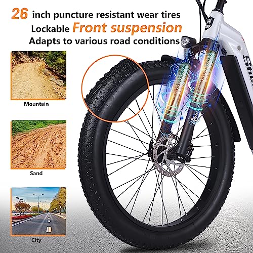 【Hochwertiges Fahrgefühl】 Dieses Hardtail Elektrofahrrad hat ein professionelles Federungssystem und einen bequemen, ergonomischen Sattel. Dies gewährleistet maximalen Komfort für den Fahrer trotz schlechten Straßen oder langen Fahrten. Erleben Sie entspannte Radtouren dank dem bequemen sattel und dem Alu-Lenker mit Ergo-Griffen. Die 26 Zoll Fat Reifen können die Reibung auf der Straßenoberfläche erhöhen und das Fahren für alle Straßenbedingungen wie Schnee, Straße, Strand und Mountain stabiler machen.