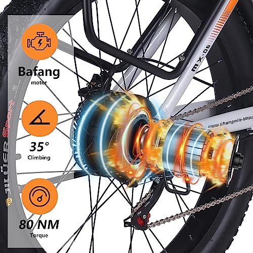 【Hervorragende Motorleistung】 Dieses Shengmilo MX06 Fat Reifen E-Bike ist mit einem leistungsstarken Bafang 48V Heckmotor ausgestattet. Bis zu 80 Nm Drehmoment bewältigt mühelos Steigungen bis 35°. Pendeln zwischen Arbeit und Hause, Ausflug, MX06 E-Trekking Fahrrad wird Ihre beste Wahl sein.